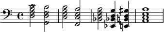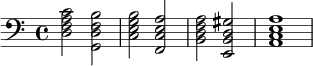 Dans le fragment ci-dessus, l’on constate que la note fondamentale de chaque accord (en l’occurrence, la note la plus grave) descend à chaque fois d’une quinte juste (elle peut également monter d’une quarte juste, ça revient au même). Mais pour rester dans la tonalité, on est obligé de s’arranger (ici entre fa et si, ni vu ni connu — le si reste naturel alors que pour une vraie quinte juste il devrait être bémol). Pour rendre la chose un peu plus intéressante, je décidai ici de faire déborder la marche d’une quinte juste supplémentaire (en ajoutant donc ce bémol qui nous fait sortir de la tonalité, puis en réajustant d’un demi-ton au dernier moment pour y revenir) :